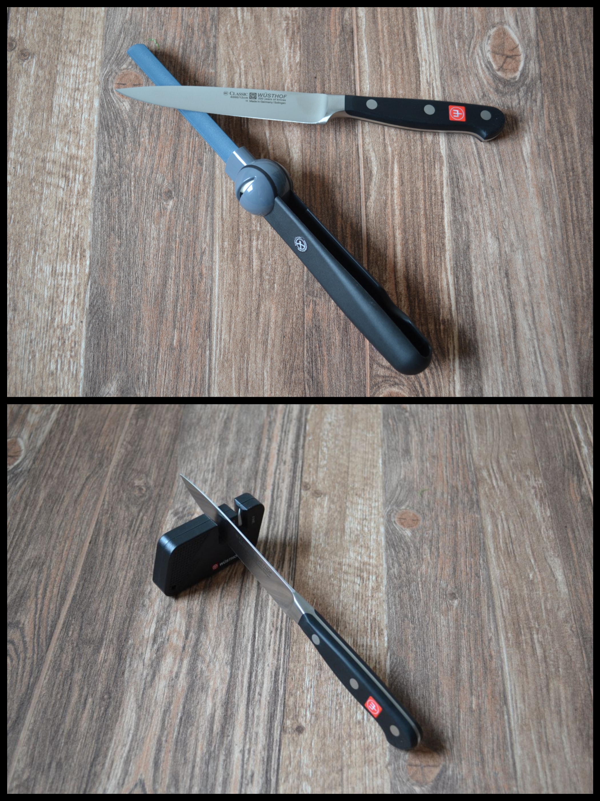 Mittlerweile gibt es sogar kleine, handliche Reise-Messerschärfer, die hier links auf dem Bild zu sehen sind. Der Messerschärfer von Wüsthof ist so klein, dass er am Schüsselbund getragen werden kann. Der Wetzstahl in der Mini-Version ist zusammenklappbar und kann so problemlos transportiert werden. Natürlich sind diese kleinen Helfer auch dann unheimlich praktisch, wenn man nicht so viel Platz in der Küche hat. Es gibt jetzt also wirklich keine Ausrede mehr für stumpfe Messer – also ran an die Messer und Schärfen:)!