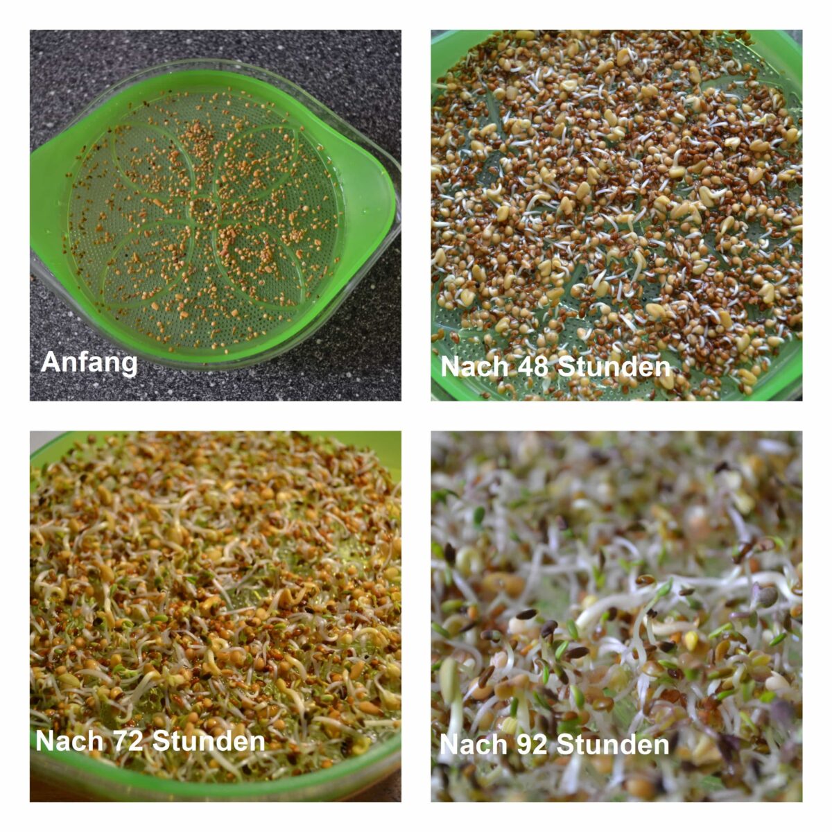 Zuerst füllt man die durchsichtige Schale bis zum eingekerbten Rand mit frischem Trinkwasser. Dann wird das grüne Sieb aufgesetzt. Auf dieses werden ungefähr 5 Gramm von dem beiliegenden Sprossenmix gegeben und gut verteilt. Das Wasser sollte die Löcher berühren. So wird die Saat erstmal 6-8 Stunden an einem hellen Ort bei etwa 20°C stehengelassen. Nach dieser Zeit müssen die Samen unter fließendem Wasser abgespült werden. Das geht durch das abnehmbare grüne Sieb recht einfach. Zeitgleich wird das Wasser in der durchsichtigen Schale gewechselt. Nun sollen es die Sprossen dunkel haben. Wir haben einen kleinen Karton über die Schale gestellt. Dort bleibt die Keimsaat weitere 48 Stunden. Wichtig ist es, die Sprossen mindestens zweimal am Tag zu abzuspülen und das Wasser in der Schale zu wechseln. Nach 48 Stunden im Dunkeln brauchen die Keimlinge nun noch weitere 48 Stunden im hellen. Auch jetzt wieder zweimal am Tag spülen und das Wasser wechseln.