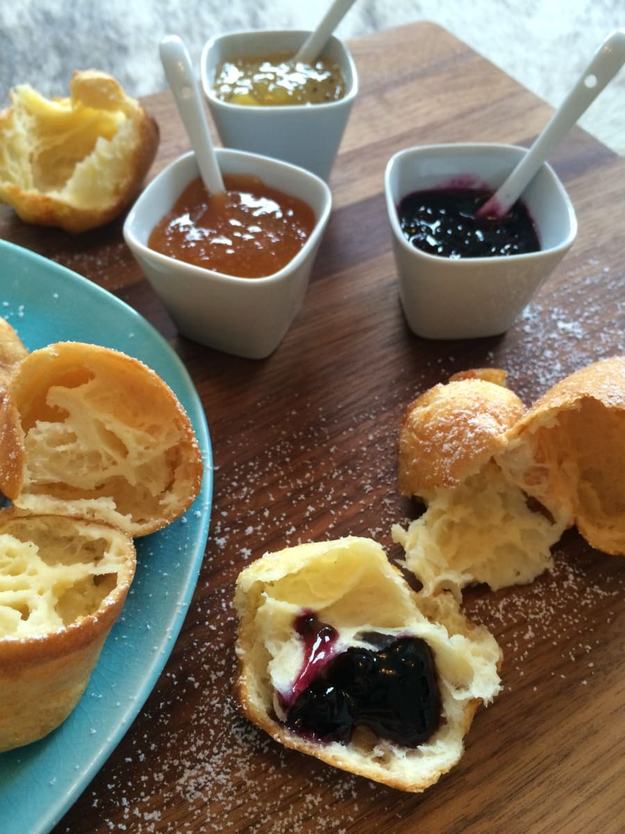 Temperatur auf 175ºC reduzieren und weiterbacken, bis die Popovers goldbraun sind (etwa 15 Minuten). Popovers vorsichtig auf ein Kuchengitter stürzen. Wir haben die Popovers ofenwarm serviert, vorsichtig auseinander gerissen und mit Butter und Marmelade (goldene Kiwi, Heidelbeere und Aprikose) verspeist.