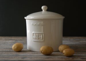Insbesondere Kartoffel und Zwiebeln müssen dunkel und kühl gelagert werden. Sonst beginnen sie zu keimen. Wenn Kartoffel zu viel Licht bekommen, fangen sie an zu grünen und geben giftiges Solanin ab und sind somit nicht mehr zum Verzehr geeignet. Sie sollten Kartoffeln auch nicht mit säurehaltigem Obst zusammen lagern. Das ausgestoßene Ethylen beschleunigt die Reifung bzw. Alterung der Kartoffeln. Die La Cucina Töpfe verfügen alle über Luftlöcher an der Seite. Dadurch entsteht ein gutes Luftklima.
