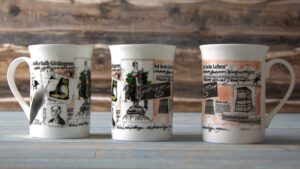 So individuell wie unser schönes Göttingen gestaltet Timmermann auch seine Motive für die Göttingen-Becher. Dieses Jahr trägt der Becher das Thema ‚Außerhalb Göttingens ist kein Leben‘. In früheren Jahren standen beispielsweise auch die Universität, große Göttinger Persönlichkeiten und andere Sehenswürdigkeiten im Mittelpunkt des Designs. Insbesondere eines darf niemals fehlen: das Göttinger Gänseliesel. Timmermann greift auch gerne das aktuelle Geschehen in der Stadt mit auf. So finden sich zum Beispiel auch Andeutung auf den Nobelpreisträger Stefan Hell.