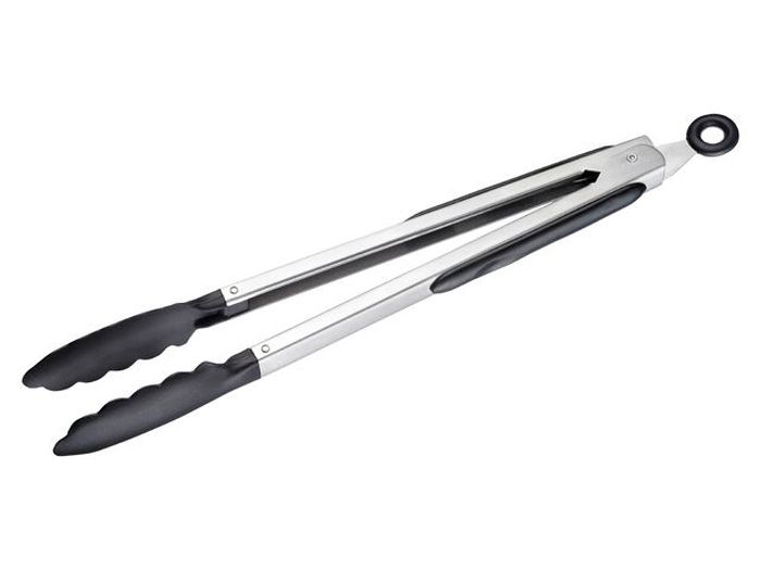 Betrachten wir nun ein ähnliches Modell aus dem Hause Westmark. Preislich liegt sie deutlich unter der Zange von Rösle. Der günstigere Preis zeigt sich allerdings auch in der Verarbeitung. Die Griffe sind auch aus Edelstahl, die Greifer sind allerdings aus Nylon hergestellt und die Griffe mit Gummi beschichtet. Auch die Westmark-Zange ist spülmaschinengeeignet. Wie bei der Röslezange findet sich auch hier am Ende eine Aufhängungsvorrichtung die gleichzeitig dazu dient, die Zange zu öffnen oder im geschlossenen Zustand zu halten. Zum Öffnen lässt sich die Öse ganz einfach nach Oben ziehen – schon öffnet sich die Zange. Mit einer Länge von 33 Zentimetern ist sie etwas länger, als das Rösle-Modell, allerdings ist der Unterschied hier nur gering. Insgesamt ist die Verarbeitung etwas „wackelig“ und wirkt leicht instabil. Dieser Eindruck wird wohl verstärkt, wenn man vorher die nahezu unkaputtbare Rösle-Zange in der Hand hatte. Aber auch das Westmark-Modell hat breite Greifer und eine große Spannweite, was das Wenden und Aufnehmen von verschiedenstem Grillgut ermöglicht. Ein deutlicher Vorteil: Die Westmark-Zange kann auch gut in Pfannen verwendet werden, da die Nylon-Greifer der Beschichtung nichts anhaben können. Diese Zange können sie also das ganze Jahr über einsetzen. Wer also ein Allround-Talent sucht und nicht ganz so viel Geld ausgeben möchte, sollte die Westmark-Zange in Betracht ziehen.