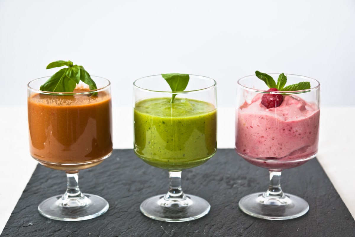Die Vorspeise (mitte) besteht aus einem Grünen Smoothie, der aus zarten Baby-Spinat-Blättern, Ananas, Orange und Apfel hergestellt ist. Die Suppe (links) besteht aus frischen Tomaten und Peperoni. Als süßen Abschluss gibt es ein Himbeer-Bananen-Eis (rechts).