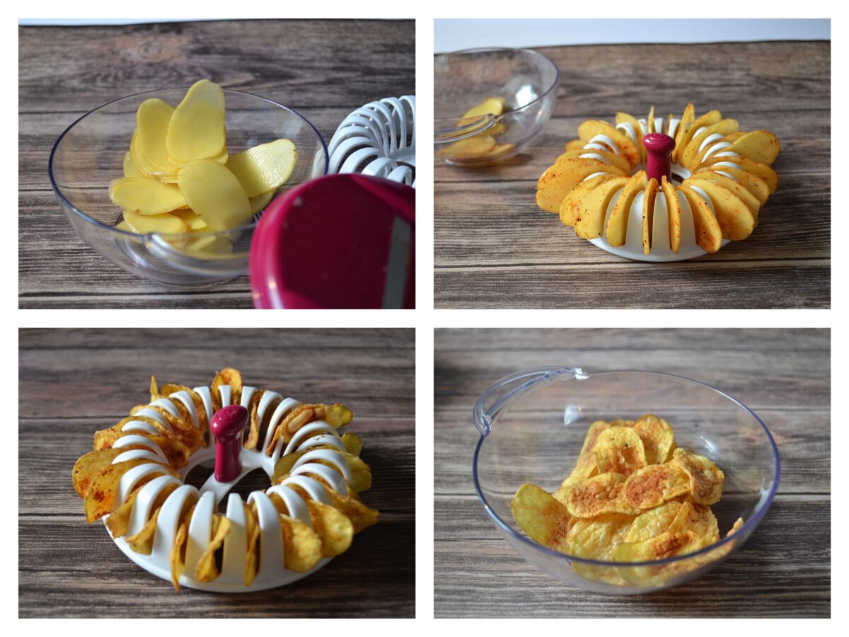 Zuerst einmal verzweifelt man etwas an dieser typischen, unsäglichen Plastikverpackung. Aber dank stabiler Schere schaffen wir es, dass Gerät auszupacken und zu betrachten. Es besteht aus einer durchsichtigen Plastikschüssel, einer Abdeckung mit integriertem Hobel, einem Halter um die Kartoffeln sicher hobeln zu können und einem runden Halter für die fertigen Kartoffelscheiben. Also schnappen wir uns zwei kleine Kartoffeln, waschen diese ab und fangen an zu hobeln. Das funktioniert erstaunlich gut. Das Messer ist scharf genug, funktioniert aber nur in eine Richtung. Der Deckel sitzt gut auf der Schale, sodass die Scheiben direkt darin landen. Nun sagt die Anleitung, man solle die fertigen Scheiben würzen. Wir entscheiden uns für einen Klassiker: Salz, etwas Pfeffer und Paprika. Dann vermischen – etwas schwierig, geht tatsächlich mit den Fingern am Besten – und die Scheiben in die Rillen „stellen“. Der Halter kommt dann in die Mikrowelle. Leider ist die Zeitangabe auf der Anleitung nur für eine Mikrowelle mit 1000 Watt festgehalten (4 Minuten).