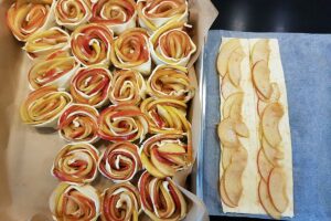 - Nun werden die Apfelringe halbiert und mit der runden Seite nach oben überlappend auf die Streifen gelegt. Die untere Seite der Streifen ca. 1cm hochklappen und dann vorsichtig den Streifen zur Rose aufrollen. Anschließend in eine Mulde der Muffin Form legen.