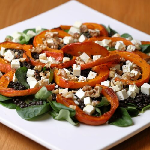 Der Herbst zeigt sein buntes Farbspiel und erfreut uns mit Leckereien aus dem Gemüsegarten. Beispielsweise mit dem Hokkaido Kürbis. Wir haben heute den Kürbis mit Belugalinsen und Feldsalat kombiniert und dazu ein leckeres Balsamico Dressing gemacht. Eine gesunde und köstliche Mahlzeit. Der Hokkaido ist wahrlich ein Multitalent. Püriert als Cremesuppe, als Kürbisstampf, gebraten in der Pfanne oder aus dem Ofen, als Auflauf oder als Quiche. Wir sind absolut begeistert!