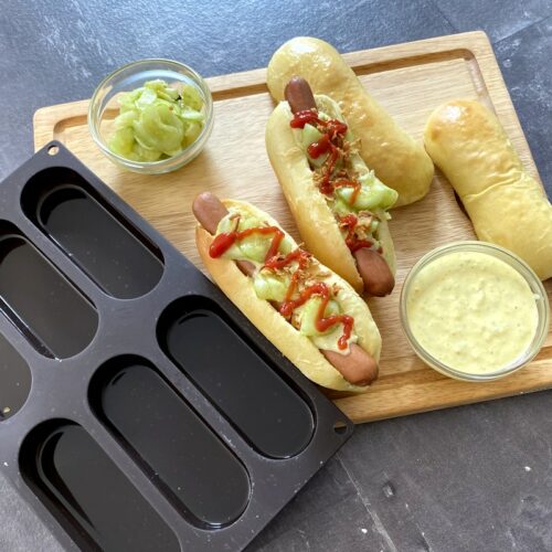 - Wenn der Teig nach einer Stunde etwa doppelt so groß ist aus der Schale holen und ohne ihn durchzukneten in 8 gleich große Teile teilen. Rund ausformen und 15 Minuten ruhen lassen. Anschließend die Teigkugeln etwas platt drücken, länglich etwas ausrollen und von der langen Seite her wieder einrollen. Teig an der Unterseite zusammenkneifen und etwas nachformen, bis die typische Form erreicht ist. Auf ein mit Backpapier ausgelegtes Backblech oder eine Silikonform für Hot Dogs legen. Teiglinge nochmals eine Stunde gehenlassen.