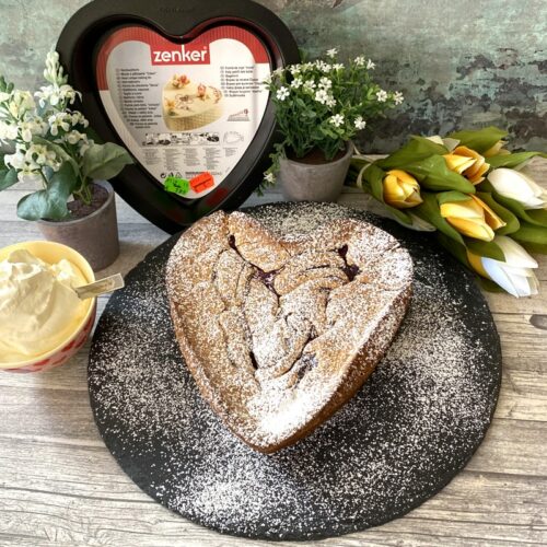 Die Rezeptmenge passt für zwei Herzformen wie auf dem Bild oder für eine 26 cm Durchmesser Spring-/Garantieform.