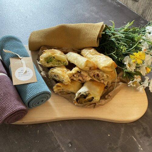 Der Strudelteig ist denkbar einfach: Wasser, Mehl, Salz und Öl. Dafür macht die Verarbeitung eine Menge Arbeit und erfordert auch noch Übung, denn er wird erst etwas ausgerollt und dann hauchdünn gezogen, so dünn, dass eine Zeitung dadurch gelesen werden kann. Wenn dieser Aufwand und das Ergebnis verglichen wird mit den im Supermarkt verfügbaren Alternativen, ist es an dieser Stelle durchaus sinnvoll ein fertiges Produkt zurückzugreifen. Gekaufter Strudelteig ist insgesamt fester und lässt sich so leichter in verschiedene Formen bringen, nicht nur als große Rolle für ein Mittagessen, auch in kleine handliche Rollen oder Dreiecke.