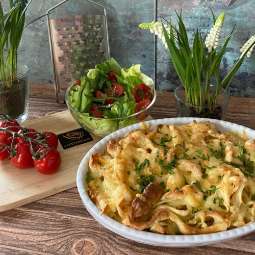 Geschichtet mit karamellisierten Zwiebeln und frisch geriebenem Käse eine deftige Köstlichkeit, die am besten mit einem leichten Salat begleitet wird. Sie sind allerdings auch ohne Käse und Zwiebeln eine wundervolle Beilage und passen zum Beispiel sehr gut zu geschmortem Wildfleisch.