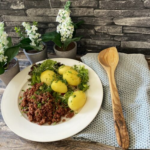 Trotz allem ist es kein leichtes Essen, weswegen dazu gekochte Kartoffeln und ein leichter Salat serviert werden.