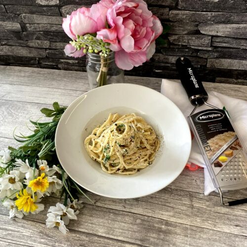 Dafür wird Schmand, mit Gewürzen und Zitrone vermengt. Noch etwas frisch geriebener Parmesan dazu und die Sauce ist bereit für die frisch gekochte Pasta. Noch etwas. Pastawasser dazu und schon kann serviert werden. So schnell und trotzdem selbst gemacht!