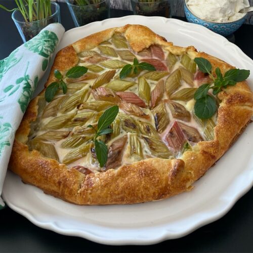 Ein sommerlich leichtes Dessert, super einfach zu machen und dann auch noch mit saisonalem Rhabarber? Wer könnte da nein sagen? Der leicht blättrige und knusprige Teig ist belegt mit einer frischen Schmandcreme und säuerlichem Rhabarber. Das schöne an einer Galette ist vor allem die Imperfektion, natürlich kann der Teig perfekt ausgerollt werden und der Belag in exakt gleicher Größe dekorativ geschnitten und die Galette damit belegt werden. Aber wenn der Teig unförmig ausgerollt wurde und der Rhabarber nur grob in ungefähr gleich große Stücke geschnitten wurde schmeckt die Galette trotzdem absolut herrlich und sieht wundervoll aus. Die rustikale Imperfektion macht den Charme einer Galette fast schon aus. Ein selbst gemachtes Dessert für alle, die für perfekte Optik keine Zeit oder Lust haben, einfach das Ausrollen eines Teiges üben möchten oder auch um mit Kindern backen zu können. Groß oder klein ausgerollt und serviert ein absoluter Genuss.